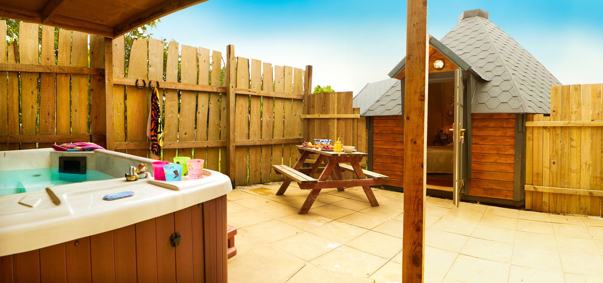 Our family hot tub lodge is our big two-roomed camping lodge and is suitable for up to six people (maximum two adults and four children under 13), complete with your very own, large, electric hot tub for everyone to enjoy. It’s a super place to spend quality time together, and the hot tub offers a great way to relax after an action-packed day in Scarborough. You’ve also got your own private paved area with a picnic bench and space for a BBQ.